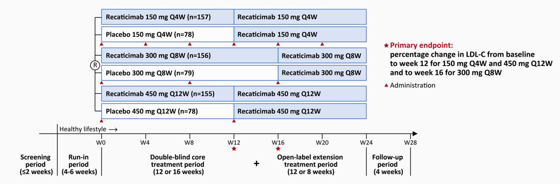 研究主要终点为与安慰剂相比,瑞卡西单抗150mg Q4W和450mg Q12W治疗12周以及300mg Q8W治疗16周后,非家族性高胆固醇血症和混合型高脂血症患者LDL-C相对于基线变化的百分比。